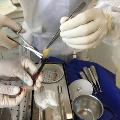 O L-PRF (fibrina rica em plaquetas e leucócitos) é um biomaterial derivado do sangue do paciente, obtido em uma coleta sanguínea no momento da cirurgia e submetido à centrifugação dando origem a esse concentrado plaquetário. O objetivo é acelerar o processo de cicatrização e reparação tecidual.